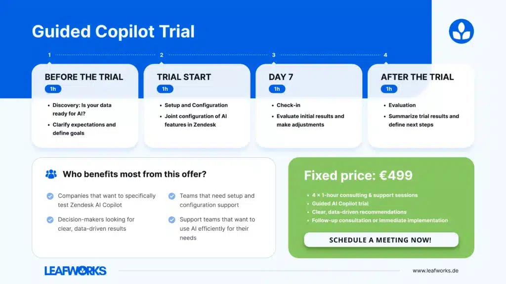 As a Zendesk Premier Partner with Copilot certification, Leafworks accompanies you from the guided trial to setup and long-term expansion. We ensure that the Zendesk Copilot integration fits your processes and unleashes its strengths exactly where they are most needed in your everyday work.